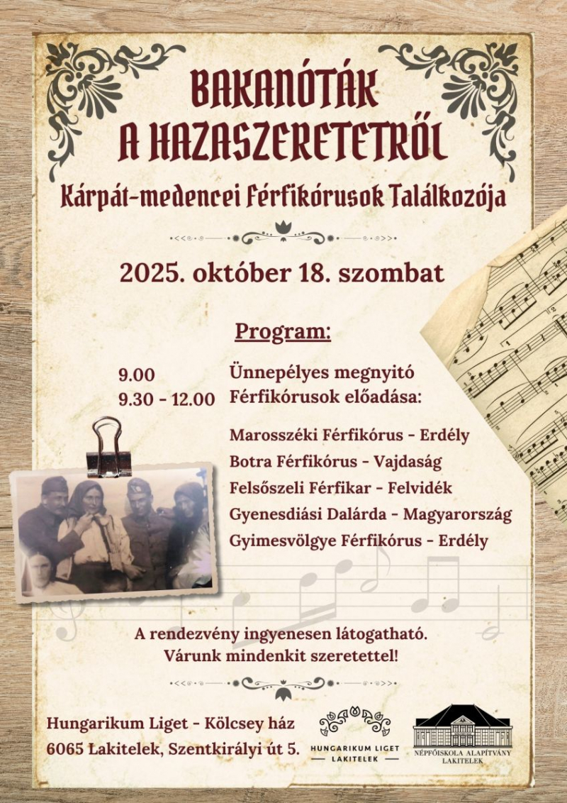 Október 18-án, szombaton 9 órától a lakiteleki Hungarikum Liget Kölcsey házában kerül sor kerülő Kárpát-medencei Férfikórusok Találkozójára.
