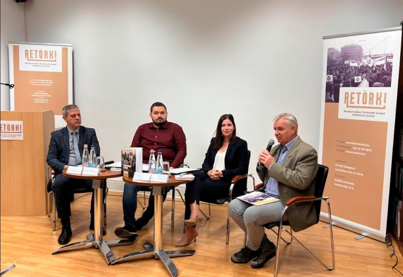 Képen (b-j): Dr. Germuska Pál történész, a Nemzeti Emlékezet Bizottsága Hivatalának tudományos tanácsadója, Kovács Balázs a RETÖRKI tudományos segédmunkatársa, Dr. Rapali Vivien Regina, a RETÖRKI levéltárának főmunkatársa, gyűjteményi tudományos- és történész szakértő, a kötet szerzője, Dr.habil. Ujváry Gábor történész, a VERITAS Történetkutató Intézet és Levéltár főigazgatóhelyettese.
